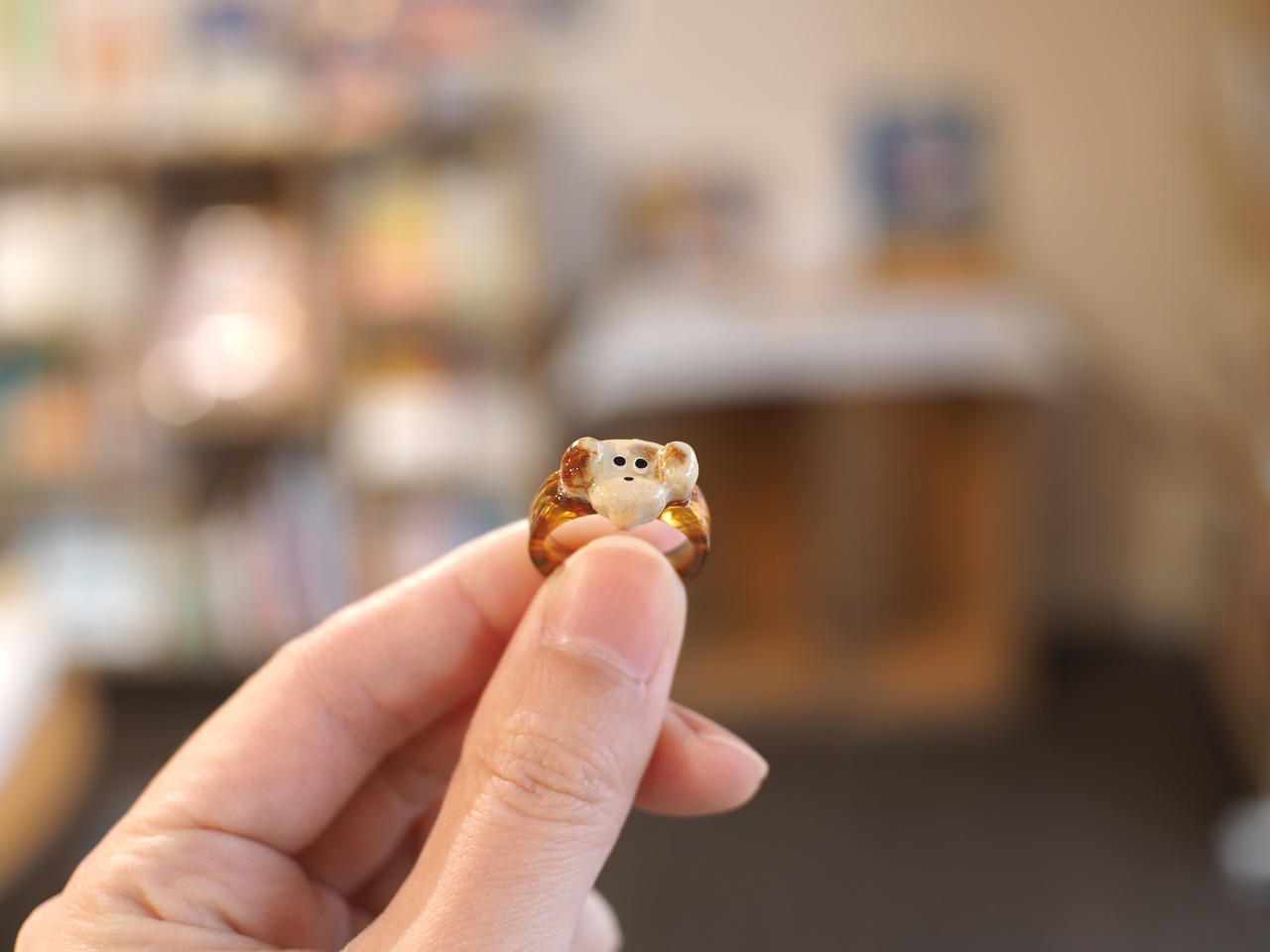 手元から愛らしい目線を向けるわんこの指輪。サイズは12号。